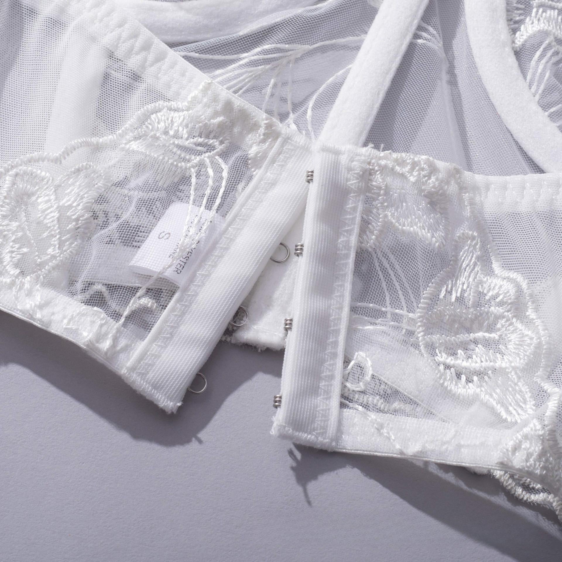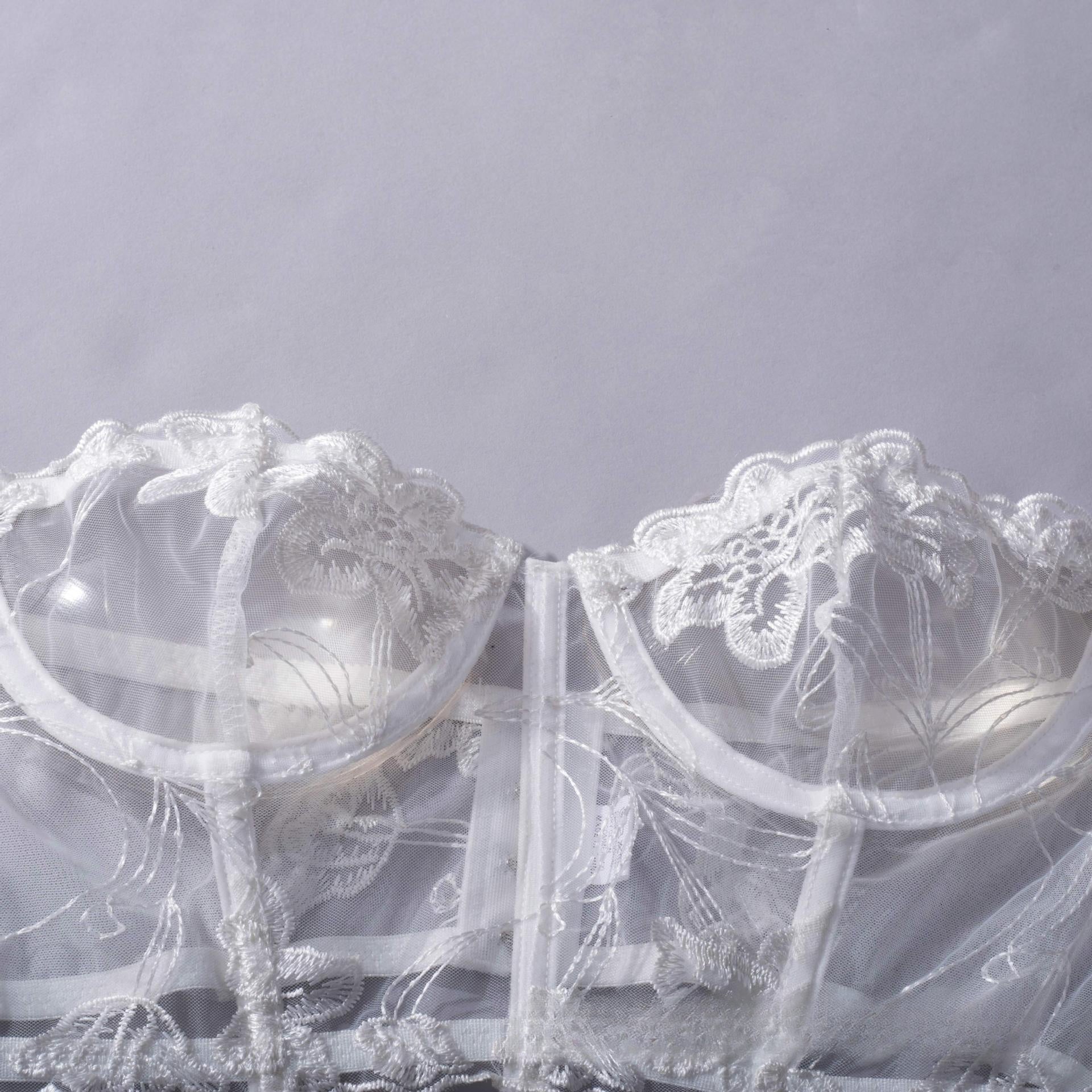 Betreten Sie mit dem Angelique White eine Welt ätherischer Verführung. Dieses romantische weiße Korsett-Ensemble ist aus zartem, transparentem Netz gefertigt, das mit komplizierten Blumenmustern bestickt ist und an die Weichheit von Blütenblättern und den Reiz des Mondlichts erinnert.
