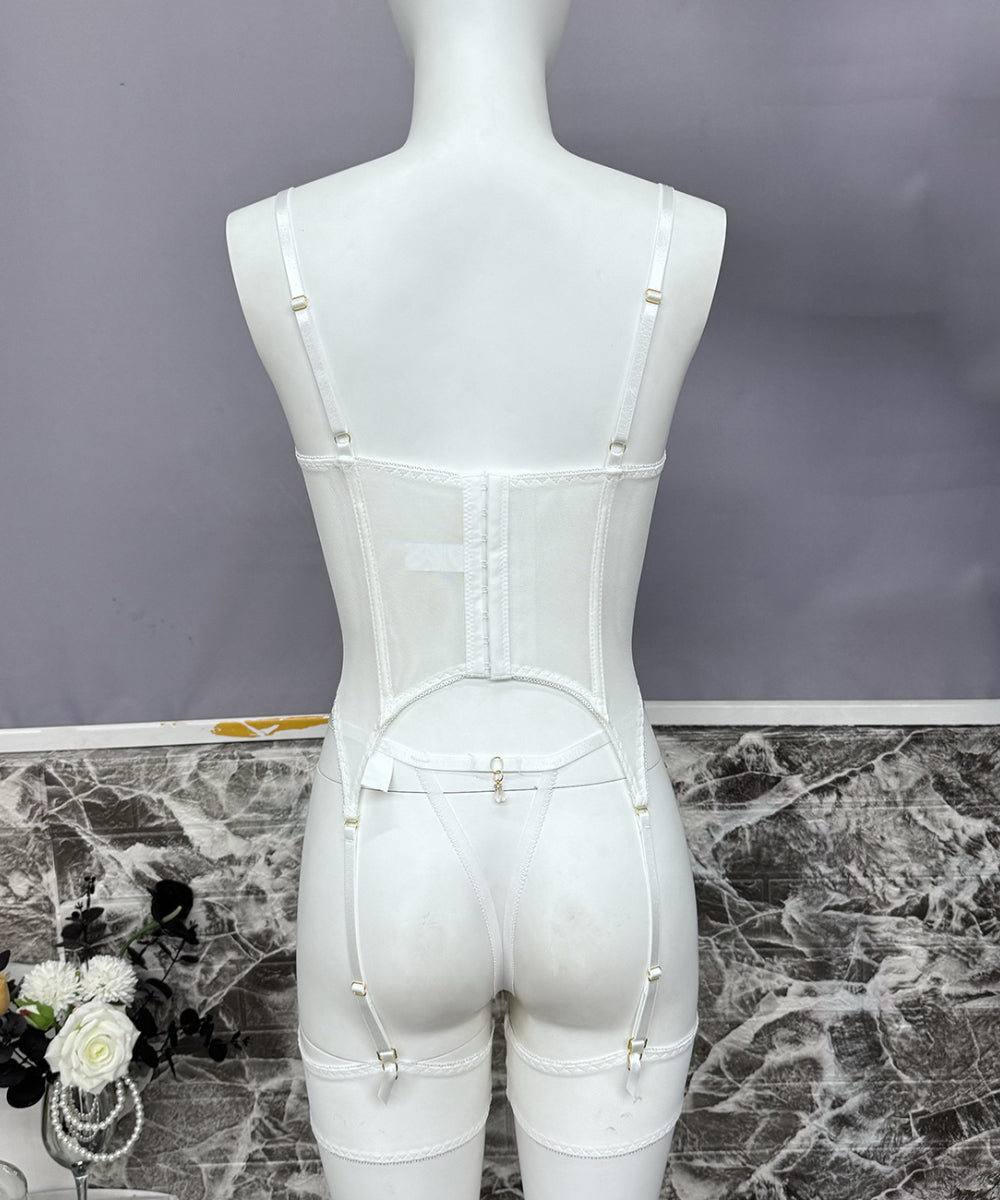 Set Includes: 1 x underwire bustier, 1 x matching thong, 2 x thigh band