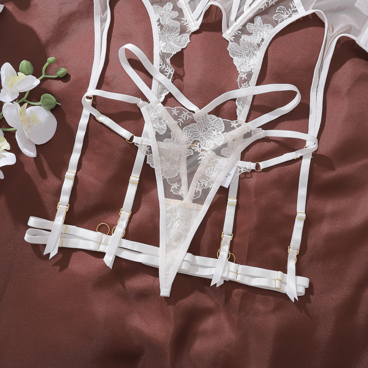Command attention in the Floral Enigma Embroidered Strappy Bustier Set —a breathtaking blend of sultry structure and delicate femininity. This intricate piece features sheer mesh panels adorned with blooming floral embroidery that dances across the cups and bodice. Crisscross satin straps and gold-toned hardware create a bold cage effect across the front, drawing the eye while offering a sculpted silhouette.